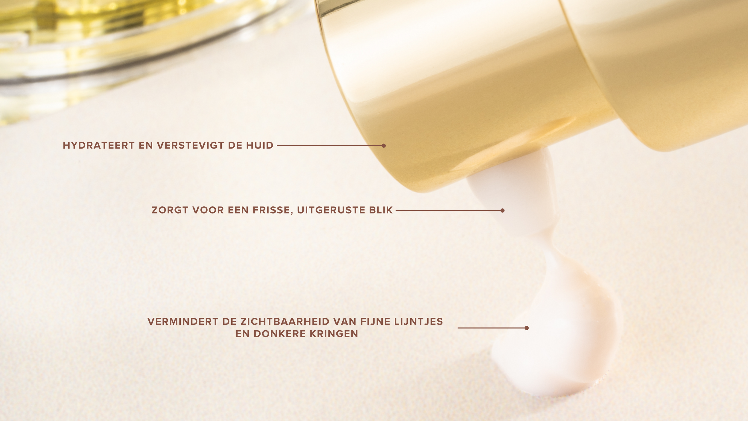 Gebruik het pompje om iedere ochtend en avond een kleine hoeveelheid aan te brengen op de ringvinger. Dep het product vervolgens zacht onder het oog en op het wenkbrauwbot om ervoor te zorgen dat het gehele gebied rondom het oog is voorzien. Herhaal het deppen tot de crème volledig is geabsorbeerd.