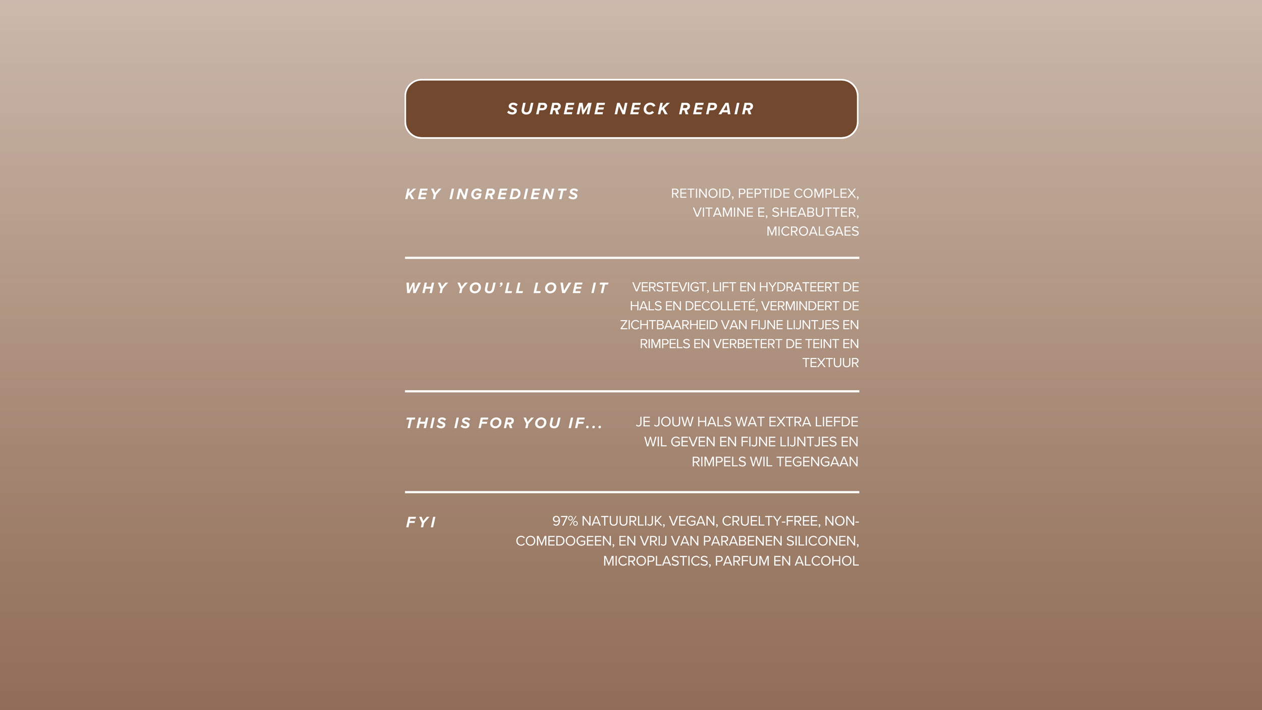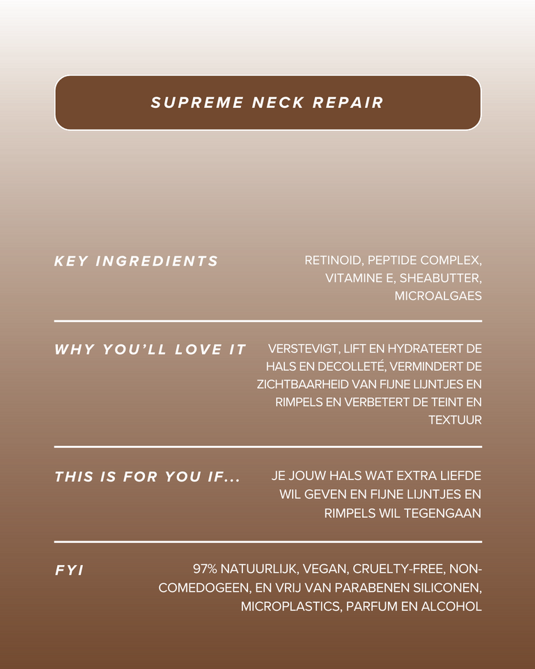 The rich, velvety texture absorbs quickly, leaving your skin silky-soft, smoothed and deeply nourished. It’s time to say goodbye to neglected necklines. This is your go-to for elegant, everyday neck and décolleté skincare.
