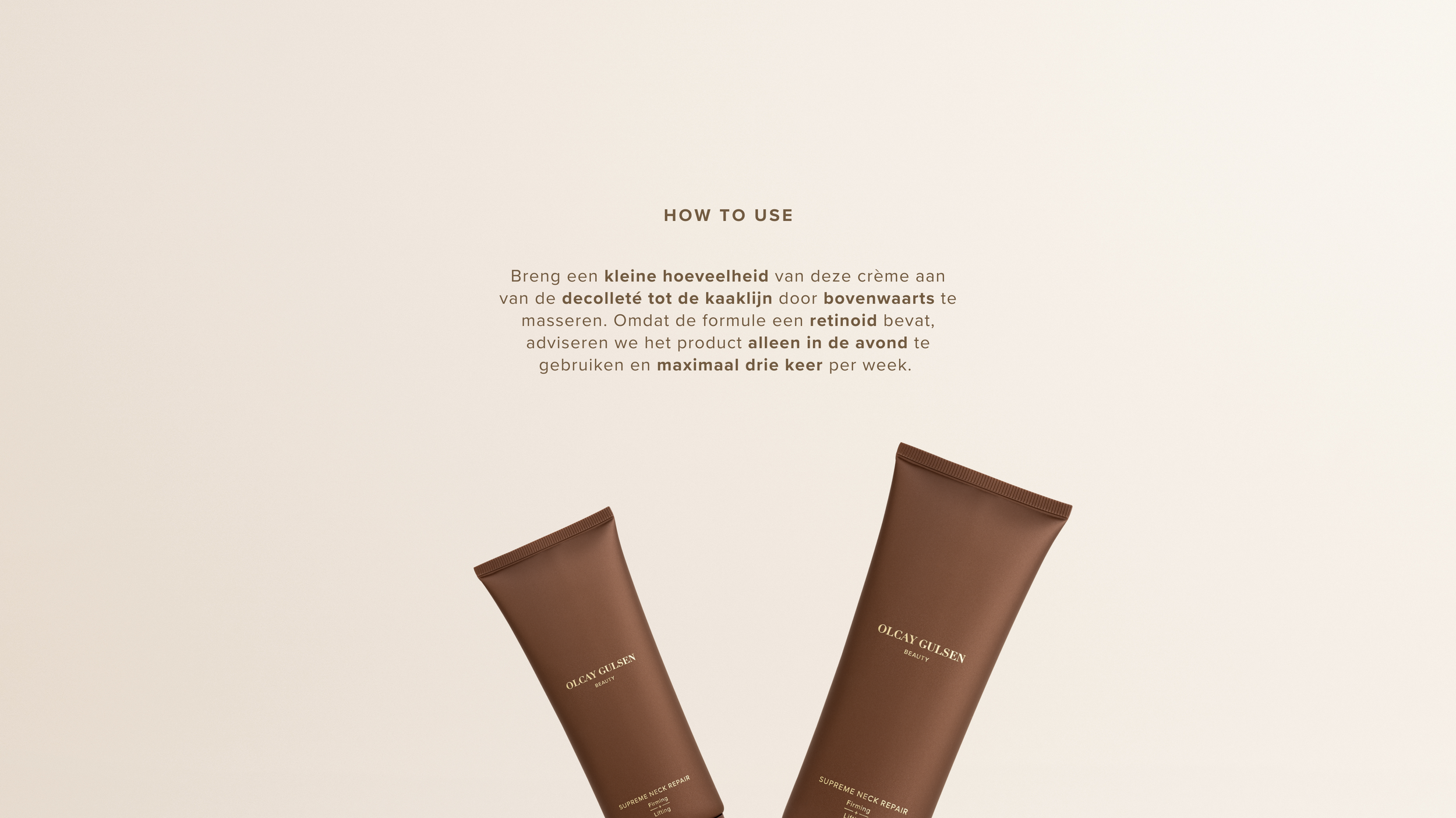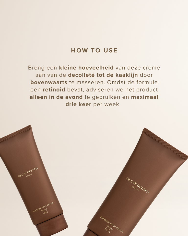 Breng een kleine hoeveelheid van deze crème aan van de decolleté tot de kaaklijn door bovenwaarts te masseren. Omdat de formule een retinoid bevat, adviseren we het product alleen in de avond te gebruiken en maximaal drie keer per week.