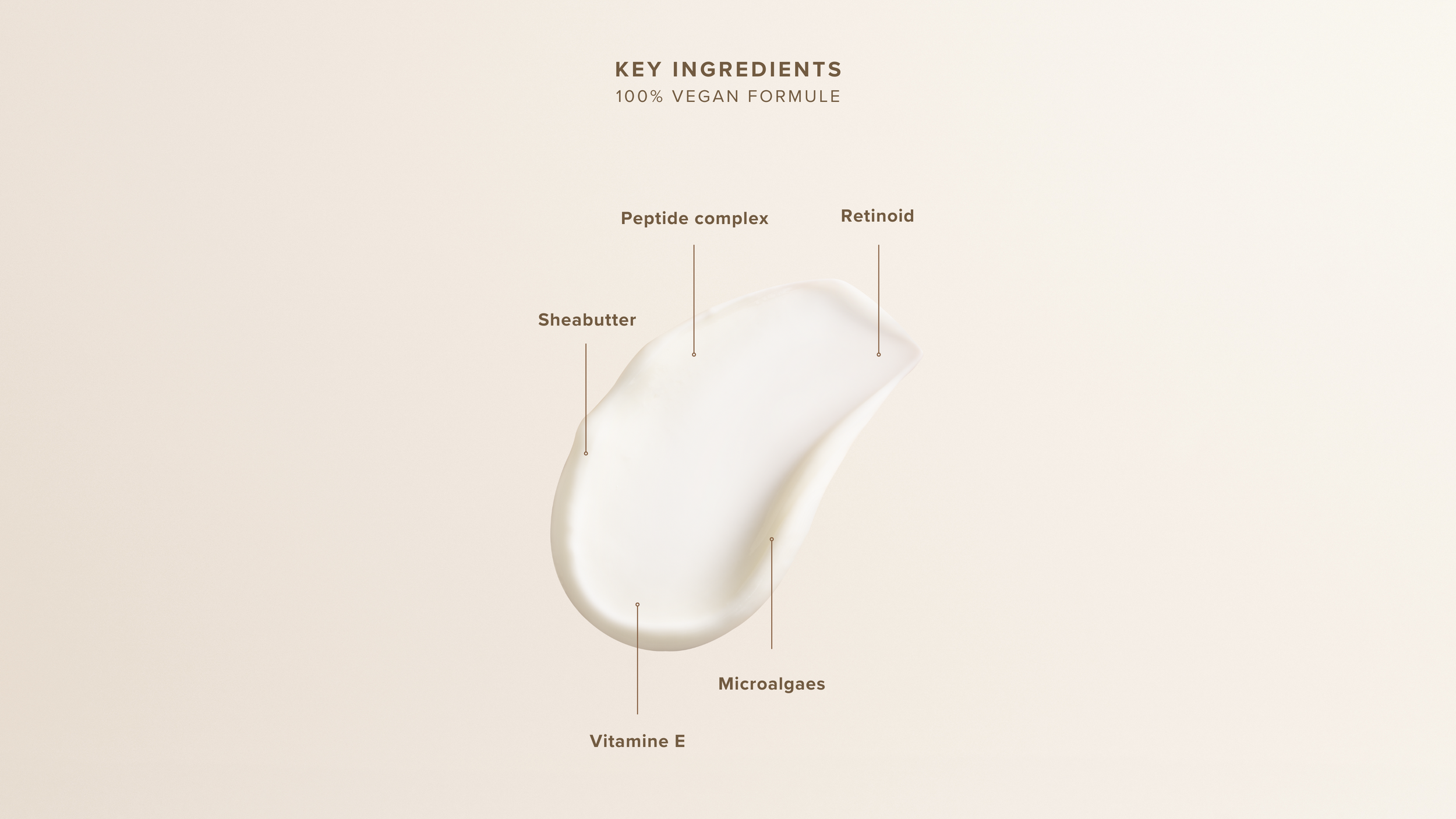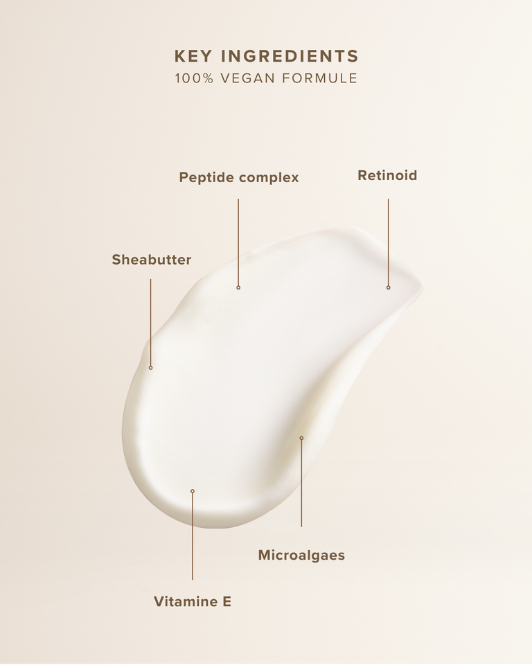Deze crème bevat een retinoïde en een peptidencomplex die de collageenproductie stimuleren, waardoor de huid steviger wordt en fijne lijntjes en rimpels verminderen. Daarnaast zorgen microalgen en vitamine E voor hydratatie en bescherming tegen vrije radicalen.