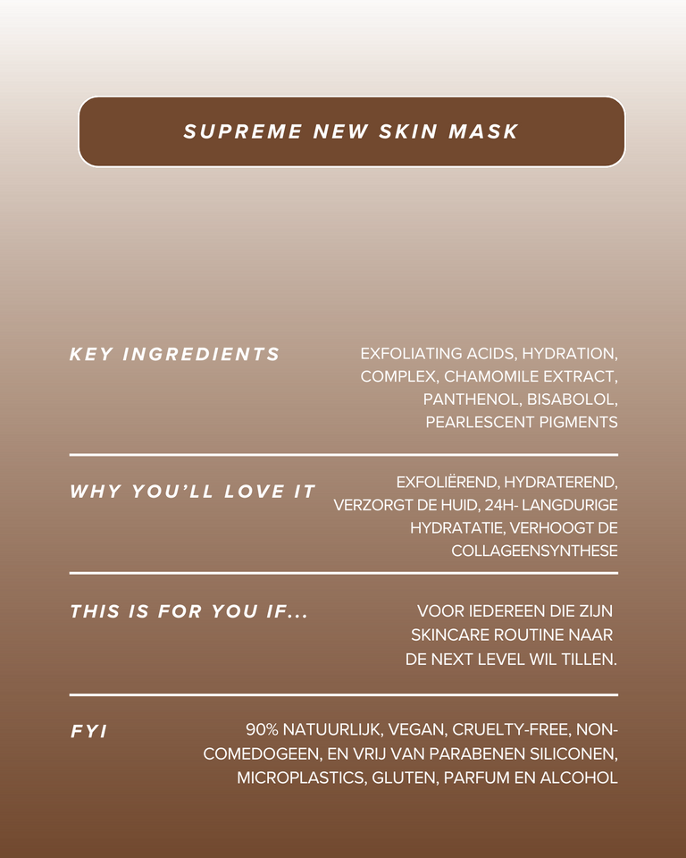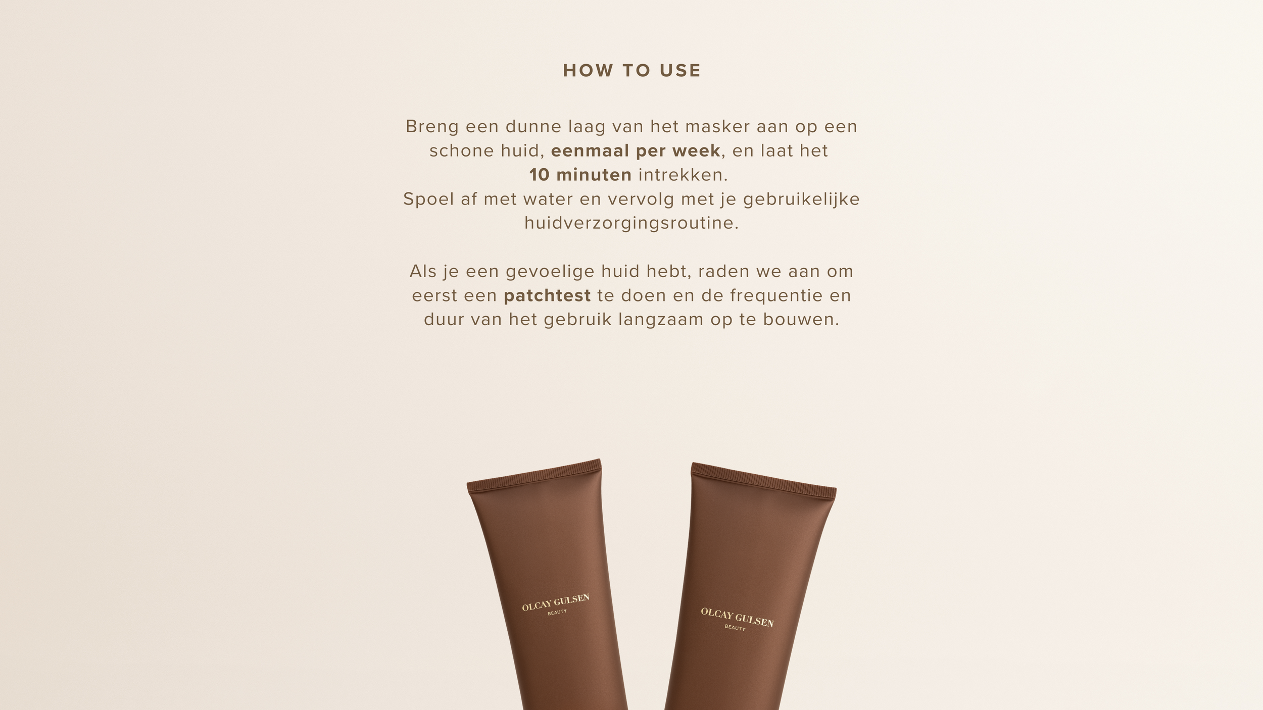 Breng 1x per week, max 3 keer een dunne laag van het masker aan op een schone huid en laat dit 10 minuten intrekken. Was het vervolgens af met water en vervolg daarna met de rest van je skincare routine. Vermijd andere exfoliërende ingrediënten en retinol en gebruik gedurende de (volgende) dag altijd een SPF. Bij een gevoelige huid adviseren we altijd eerst een patch test te doen en het gebruik en de duur van het masker op te bouwen.