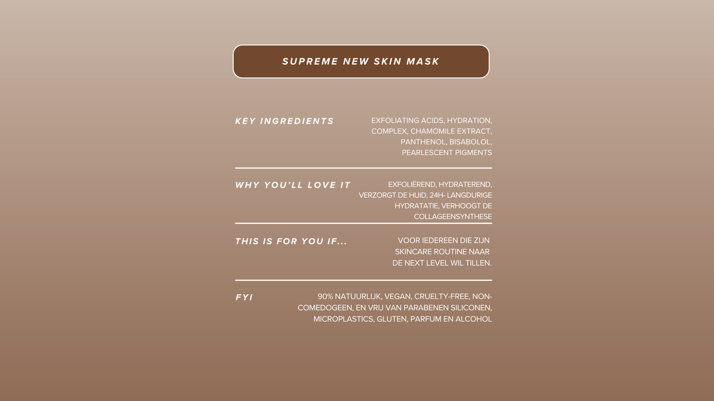 Dit product is 90% natuurlijk, vegan, geschikt voor de zwangerschap, niet-comedogeen, cruelty-free en vrij van parabenen, siliconen, microplastics, gluten, parfum en alcohol.